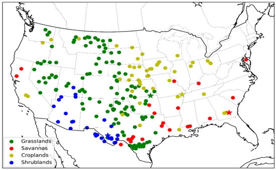 The yearly MODIS Landcover dataset (MCD12Q1) was obtained with the same user-specified spatial extent as LAI (see Section 2.2). The original spatial resolution of MCD12Q1 is 500 m and contains five types of landcover classification schemes []. We used the landcover scheme classified by International Geosphere–Biosphere Programme (IGBP). The IGBP classifies the land surface into 17 categories: evergreen needleleaf/broadleaf forest, deciduous needleleaf/broadleaf forest, Mixed forest, closed/open shrublands, woody savanna/savanna, grasslands, croplands, permanent wetlands, urban and build-up lands, croplands/natural vegetation mosaics, snow and ice, barren, and water bodies []. The landcover of each study site was the mode of the landcovers in the user-specified extent (8.5 km by 8.5 km, 289 original 500 m by 500 m MODIS pixels). Study sites dominated by woody savanna were further classified as savanna; closed/open shrubland were classified as shrubland; and cropland/natural vegetation mosaic were classified as cropland.