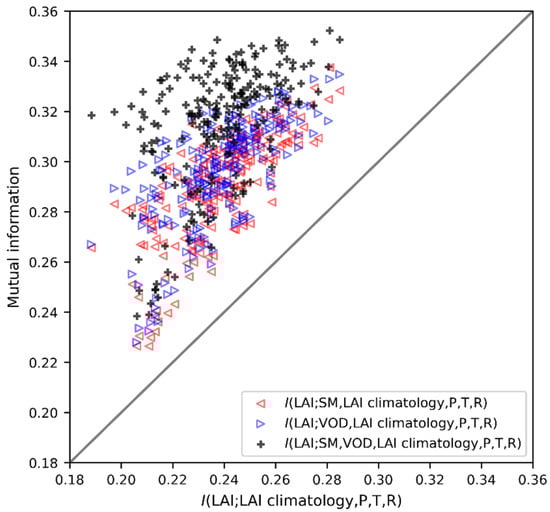 Mutual information between LAI and LAI climatology (LAIC), precipitation (P), temperature (T) and radiation (R) (based predictors) against the mutual information between LAI and soil moisture (SM) and base predictors (red triangles), the mutual information between LAI and VOD and base predictors (blue triangles), and mutual information between LAI and base predictors and VOD and SM (black crosses).