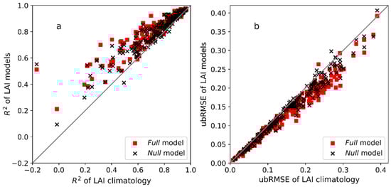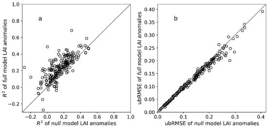 The R2s of “full” model predicted LAI anomalies against the R2s of the “null” model predicted LAI anomalies (a), and ubRMSE of “full” model predicted LAI anomalies against the of the “null” model predicted LAI anomalies (b).
