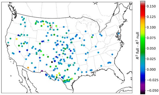 The spatial mapping of difference in R2s between the “full” models and “null” models for the LAI prediction.