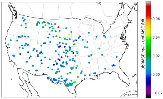 The spatial mapping of difference in ubRMSE between the “null” models and “full” models for the LAI prediction.