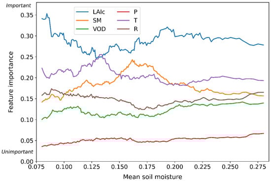 The level of feature importance of LAI climatology (LAIC), soil moisture (SM), vegetation optical depth (VOD), precipitation (P), temperature (T) and radiation (R) from the “full” models against different soil moisture conditions.