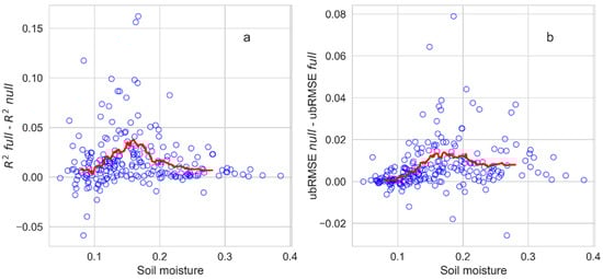 The difference in R2s between “full” model and “null” model reconstructed LAI predictions as a function of soil moisture (a), and the reduction in ubRMSE from the “null” model to “full” model as a function of soil moisture (b). The red lines in (a,b) are the moving average using a window length of 15% of the data.