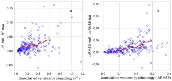 The difference in R2s between “full” model and “null” model reconstructed LAI predictions as a function unexplained variance by LAI climatology (1-R2 between LAI and its climatology) (a), and the reduction in ubRMSE from the “null” model to “full” model as a function of unexplained variance by LAI climatology (ubRMSE of LAI climatology). The red lines in (a,b) are the moving average using a window length of 15% of the data.