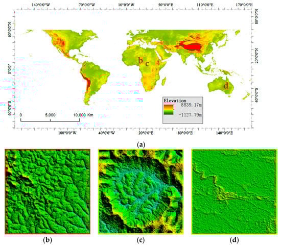 SRTM 1 data and the terrain of some experimental areas. (a) SRTM 1. Local enlargement of (b) area b, (c) area c, (d) area d marked by the corresponding letters in the figure.