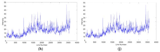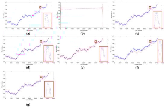 The dense spikes in area S31E147 were due to the effects of mixing errors (Figure 11a). The local zoom indicated that our method removed the spikes well, indicating that the mixing errors had been eliminated from the data and the curve fluctuations were well preserved, so the structure and elevations of the data image were well preserved (Figure 11f). Low-pass filtering was destroyed due to the ringing phenomenon at the edge, and the elevation data and data structure were destroyed (Figure 11b–e,g). TV produced a smooth curve, indicating that the detailed structure was lost to some extent, and UTV and LRSID did not obviously affect the removal of spikes, which led to residual stripes and random noise. The Gallant data set clearly deviated from the original range of the curve, and the curve was over-smoothed.
