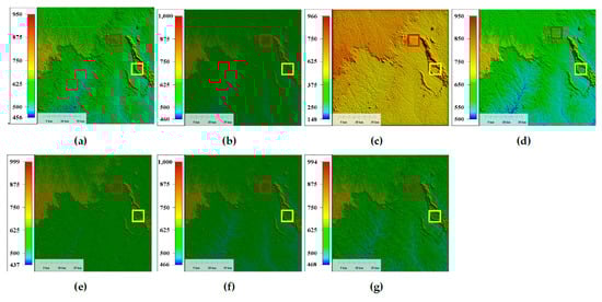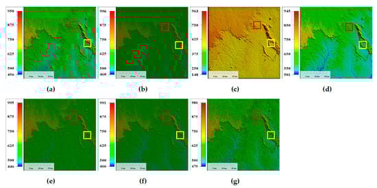 Results of the real experiment for area S31E147 (unit: meter). (a) Original S31E147 area, (b) low-pass filter, (c) TV, (d) UTV, (e) LRSID, (f) Gallant and (g) LRGS.