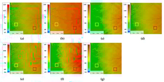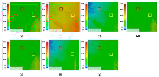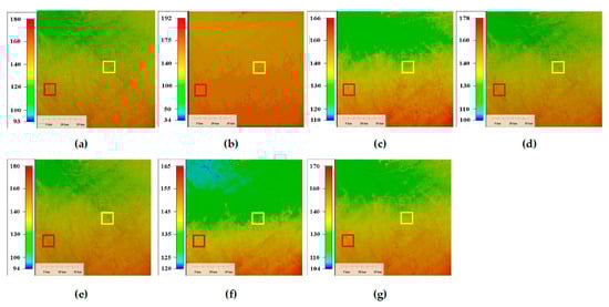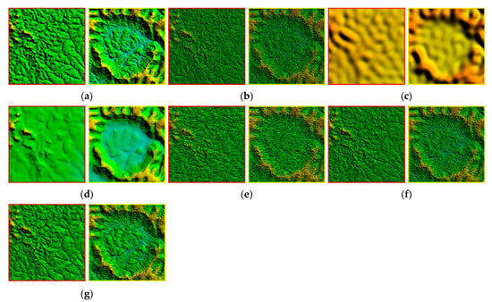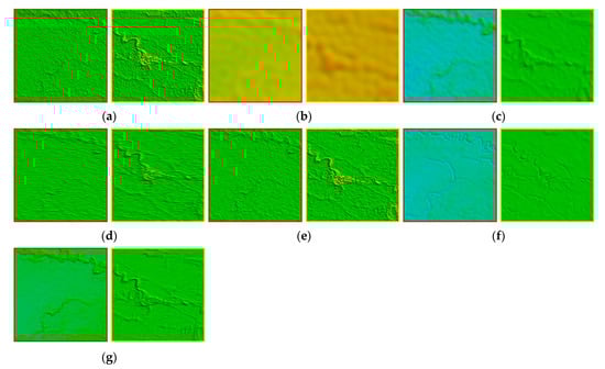 Local enlargement of the results of the simulation experiment for area N01E12 (Figure 7). Local enlargements for (a) area N01E12, (b) mixed error added, (c) low-pass filter, (d) TV, (e) UTV, (f) LRSID and (g) LRGS.