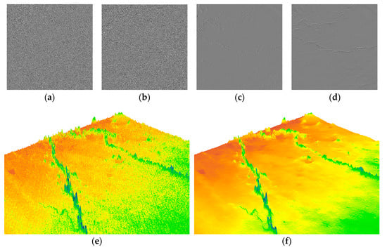 Various methods for eliminating errors have been proposed to resolve these problems. Methods based on spatial domains [6,7] remove random noise from data by calculating spatially varying noise variances to construct filters of different window sizes, but local smoothing inevitably affects local non-noise components when noise components are associated with smoothing, causing the loss of detail in the terrain. This type of method is no longer applicable for removing stripe errors. A combined domain-based method [8] implements de-striping by cross-filtering the stripe direction and the direction orthogonal to the stripes, but this type of method will also cause the loss of data for stripe direction, and different kernel functions need to be manually modified for different components of errors of stripe direction. Statistical methods [9,10] have obtained prior information of errors by matching the data set of real elevations and the target data set, thereby eliminating stripes and spikes. These methods effectively remove errors but must obtain a data set of true elevations, which is often difficult. Methods based on Fourier transformation [3,11,12] separates low- and high-frequency components in the data, targeting the removal of frequency components of the stripes. These methods, however, are not sufficiently robust. The effect of removing stripes is not obvious when stripe errors in the actual data have complex and diverse frequency components [13].