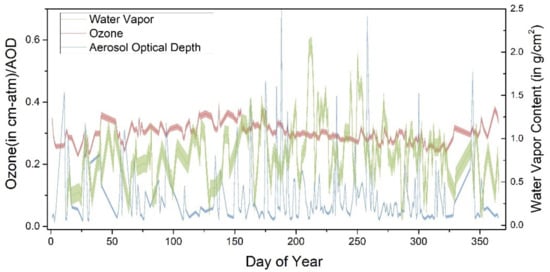The temporal atmospheric conditions over Railroad Valley Playa site in 2019, including aerosol optical depth at 550 nm, water vapor and ozone content.