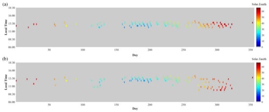 The time, date and solar zenith angle of the quality-controlled matchups between FY-3D MERSI-II observations and in-situ measurements at Railroad Valley Playa site involved in calibration procedure in this study: (a) FY-3D MERSI-II observations; (b) in-situ measurements.