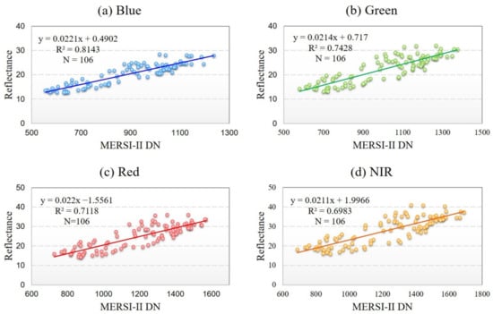 The relationships between in-situ measurements simulated at-sensor reflectance and DNs of FY-3D MERSI-II for the four spectral bands using the reflectance-based method with BRDF correction: (a) blue band; (b) green band; (c) red band; (d) NIR band. Least-squares linear fitting resulted in vicarious calibration coefficients.