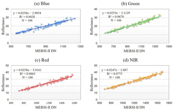 where is the multiplicative rescaling gain for a specific band and is the band-specific additive bias. The least-square linear fitting was utilized then in this study to calculate the calibration coefficients and for MERSI-II specific band based on Equation (11).