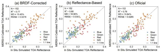 Figure 8 depicts the MERSI-II calibrated TOA reflectance against the in situ simulated TOA reflectance for the three versions of calibration coefficients, respectively. The MERSI-II TOA reflectance calibrated by coefficients derived using the proposed BRDF-corrected method (Figure 8a) agrees well with the in situ simulated reference data, as indicated by the higher R2 of 0.77 and smaller MD of 10.45% and RMSE of 0.0278. Most of the scatters are aligned closely with the 1:1 line, with relatively discrete distribution observed in a few scatters of red and bands. The quite similar performance of official coefficients are observed in Figure 8c, with almost the same figures as the BRDF-corrected method generated coefficients (R2 of 0.76, MD of 10.84% and RMSE of 0.0285). It is no surprise because these two versions of coefficients have no significant difference (see Table 1).