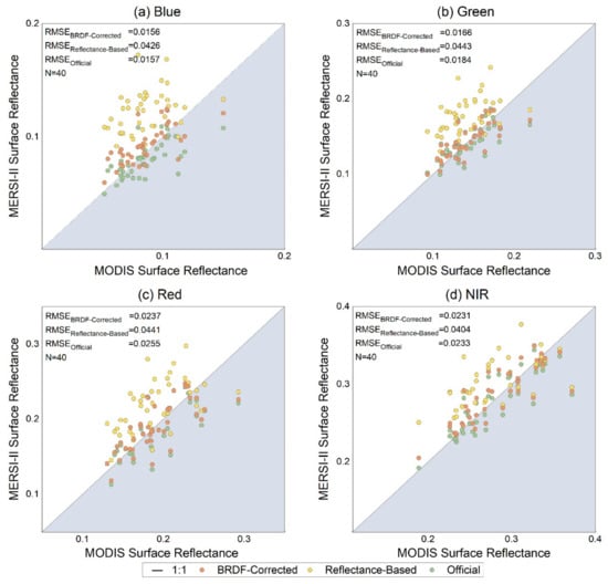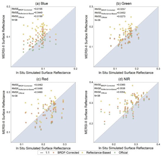 Figure 10 shows the same pattern as Figure 9 that similar performance could be observed for coefficients obtained by the proposed method (BRDF-corrected) and officially provide coefficients, while poor performance occurred in results of coefficients derived using the reflectance-based method without BRDF correction. The MERSI-II surface reflectance calibrated by the BRDF-corrected coefficients fits well with the MODIS simulations, with the lowest RMSEs for each band (0.0156 of blue band, 0.0166 of green band, 0.0237 of red band, and 0.0231 of NIR band). The official coefficients result in almost the same figures of RMSE for the four bands as the BRDF-corrected coefficients, while the coefficients obtained from the reflectance-based method perform poorly with the highest RMSEs for each band. For the distribution of the points, the validation data of the BRDF-corrected coefficients align along the 1:1 line, while the results of official coefficients show slight underestimation and obvious overestimation occurred in the results of coefficients obtained using the reflectance-based method.