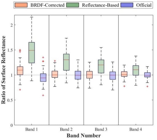 Also, the three versions of calibration coefficients obtained by the BRDF-corrected and reflectance-based methods and officially provided are all participate in. A similar pattern could be observed in Figure 11 as in Figure 10. Surface reflectance obtained by the BRDF-corrected method is the closest to the MODIS benchmarks with ratios mostly near 1 for most bands, while those calibrated by the coefficients from reflectance-based method vary from the true values with boxes distributed far from the line of ratio equal to 1. In addition, the ratios of reflectance are mostly larger than 1 for reflectance-based method obtained coefficients, while for the version of official coefficients, the ratios are mostly lower than 1 in the case of each band. The results of validation with MODIS products (Figure 10 and Figure 11) indicate that the calibration coefficients derived by the BRDF-corrected method adopted in this study perform the best while coefficients from the reflectance-based method without BRDF correction tend to overestimate surface reflectance and officially provided coefficients lead to underestimation.