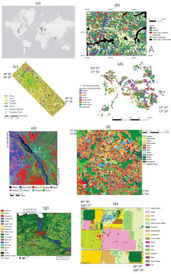 Locations of the Joint Experiment for Crop Assessment and Monitoring (JECAM) sites contributing to this research in (a) a world map, and land cover of each site including (b) Argentina, (c) Canada, (d) Germany, (e) India, (f) Poland, (g) Ukraine and (h) USA-North Dakota (ND). The white polygons are the boundaries of the test sites.