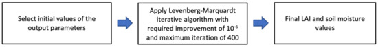 The WCM model is a semi-empirical model and has six coefficients (A, B, C, D, E1 and E2) and two unknown variables (in our study, LAI and soil moisture). Therefore, prior to inverting the WCM to estimate LAI and soil moisture, the model must first be calibrated, a process necessary to parameterize these six coefficients. The non-linear least square method [41] was used to parameterize the model for each crop type and each polarization (i.e., VV and VH). Hosseini et al. (2015) demonstrated that calibration of the WCM model for different crop growth stages provided better results compared to generating one set of coefficients for the whole growing season. Therefore, in this study, the WCM model was calibrated for three ranges of LAI per crop (Table 3). The ranges of LAI and soil moisture associated with the data used in this study are shown in Table 3. Wheat has the largest range in LAI, followed by corn and soybeans, with the smallest LAI range reported for rice. The LAI range for soybeans, when considering sample points where soil moisture was also measured, is more limited (0.05–4.18 ). The thresholds for groupings of LAI were crop type-specific, given that development stages for each crop were the determining criteria for establishing these class limits (Table 3). After the model calibration, the Levenberg–Marquardt algorithm [42] was used to independently estimate LAI and soil moisture [11]. This algorithm needs initial values (first guesses) for LAI and soil moisture. LAI values of 1 and soil moisture values of 0.20 were used as initial values. Subsequently, the model improves these values based on an iterative algorithm. The iterations stop when the improvement of the values in two consecutive iterations is less than 10−6 or the number of iterations reaches 400. These steps are also shown in Figure 2.