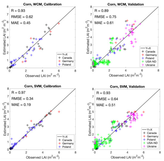 From Figure 3, it is observed that for both WCM and SVM models, the distribution of validation points for corn generally mimics that of the calibration points. For example, at an LAI range of 1–2 , the USA-ND results were underestimated by WCM, similar to the underestimation of LAI by this model for the calibration points. Better calibration of the SVM model provided more accurate LAI estimates for independent validation points. At the LAI range of 2–5 , the calibration results show a better fit for the SVM model compared to the WCM model. For the LAI range of 5–6 , the number of calibration points is lower and as such, the model fit for the WCM is poorer relative to that observed at lower LAI. As such, more scatter is observed at higher LAI and for data collected in the Ukraine, LAI is underestimated at this period of peak canopy development. In general, over- or under-estimation during calibration resulted in a similar degree of scattering during validation, for both models. Increasing the number of calibration points and improving the distributed through the entire range of LAI will improve the calibration of both models. This improved calibration will lead to a reduction in errors of estimate especially for the WCM model that showed more scatter.