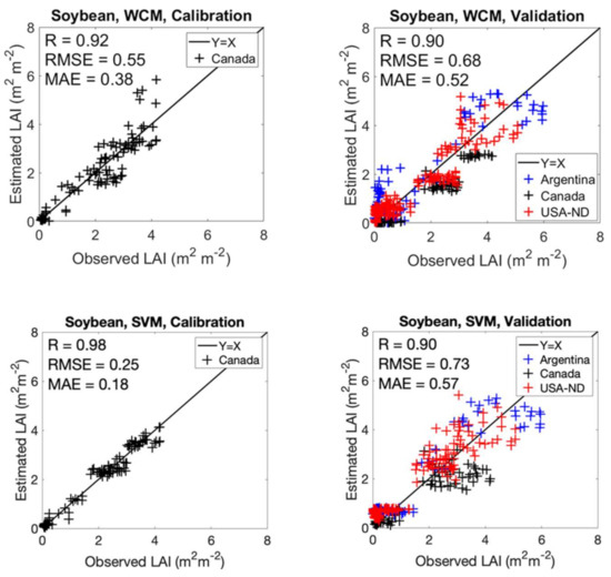 For soybean, the in situ points from Canada JECAM are in the LAI range of 0–4.2 yet some of the validation points from the Argentina JECAM site are out of this range, reaching a maximum LAI of 6.1 (Figure 4). For these validation points, where LAI is beyond the LAI range used during model calibration, both the WCM and SVM underestimated LAI. However, it is encouraging to observe that both models performed well in estimating LAI within the range of leaf area used to calibrate. As reported for corn, the distributions of the validation and calibration points are similar which indicates robust calibration of both models. For example, for the LAI range of 2–3 , the WCM underestimates LAI for both the calibration and validation points. Errors could be reduced with inclusion of additional calibration data from a larger number of JECAM sites. For the LAI range of 3–6 , the underestimation is more pronounced. Soybean canopies and LAI ranges vary from region to region. This is due not only to climatic and soil variations, but also differences in cultivars and seeding. Even within the Canadian site, farmers vary planting densities among fields, with some fields double row cropped and others planted in single rows. As such, the range of LAI for Canada does not necessarily reflect the LAI ranges for Argentina and USA-ND sites. Lower LAI is measured at the site in Canada with maximum LAI at around 4.5 In contrast, in Argentina and USA-ND, soybean canopies reach LAIs in the range of about 3–6 . This example underscores the importance of multi-site collaborations to exploit pooled data over wide ranges of crop conditions. Continuing these joint initiatives will help in the development of robust modeling.