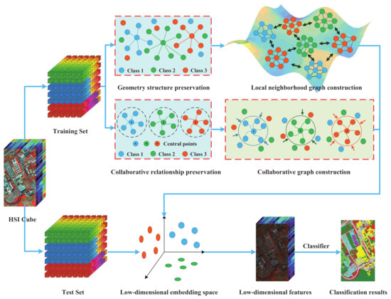 To characterize the discriminative properties and intrinsic structure of the HSI data, a local constrained manifold structure collaborative preserving embedding (LMSCPE) method was proposed for DR. LMSCPE first designs a novel CR model to discover the collaborative relationship between different samples that belong to the same class. Based on the collaborative representation coefficients, it constructs an intraclass collaborative graph and an interclass collaborative graph to characterize the intraclass compactness and the interclass separability. Then, it selects neighbors to construct a local neighborhood graph, which can effectively preserve the local geometric structure of HSI. After that, the collaborative graph and local neighborhood graph are incorporated to learn an effective projection matrix. LMSCPE can preserve the local neighborhood structure in HSI and enhance the discrimination power of embedding features. The flowchart of the proposed LMSCPE method is shown in Figure 1.
