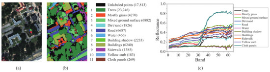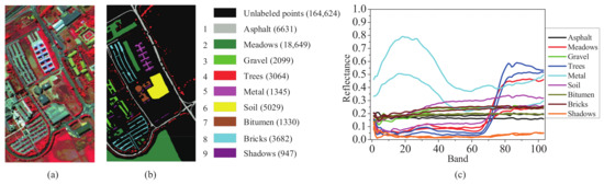 PaviaU hyperspectral image. (a) False color image. (b) Ground truth. (c) Spectral curves. (Note that the number of samples for each class is shown in brackets).