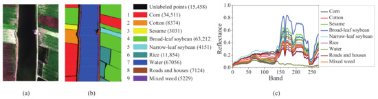 LongKou hyperspectral image. (a) False color image. (b) Ground truth. (c) Spectral curves. (Note that the number of samples for each class is shown in brackets).