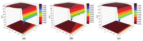From Figure 6, we can see that parameter has a strong influence on the classification performance of LMSCPE, which indicates that Tikhonov regularization helps the CR model to obtain more appropriate collaborative coefficients for constructing adjacency graphs. That is, Tikhonov matrix is an effective distance-based measurement between sample pairs, it can adjust the collaborative coefficients of each pixel adaptively. When two pixels in HSI have a similar spectrum, then the distance between them will be small, the introduction of the Tikhonov regularization will cause the corresponding weight coefficient to get bigger, thereby enhancing the effectiveness of adjacency graph structure and improving the discrimination ability of the DR model. Besides, an increasing leads to a subtle improvement on classification accuracy, because it can explore the local neighborhood structure and enhance the aggregation of HSI data. To achieve the best classification accuracies, we set and to 60 and 4 for the PaviaU data set, 70 and 3 for the LongKou and MUUFL data sets in the experiments.