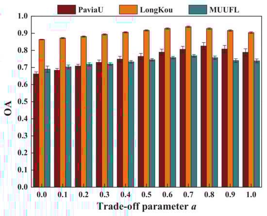 According to Figure 7, the OAs first improve with the increase of a and then slightly decrease at the peak value, which indicates that both collaborative graph and local neighborhood graph contribute to enhance the classification performance. Aiming to achieve the best classification performance, we set a to 0.7 for the PaviaU and MUFFL data sets and 0.8 for the LongKou data set in the following experiments.