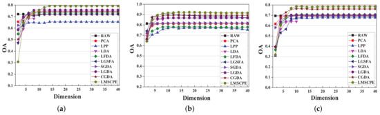 For the above-mentioned DR methods, the value of the embedding dimension d determines the effectiveness of the low-dimensional embedding features, and has an important impact on the final classification performance. Therefore, we analyzed the change of OAs with respect to different embedding dimensions d in Figure 8. In the experiments, 50 labeled samples from each type of land covers were randomly selected as training samples, and the remaining were used as test samples.