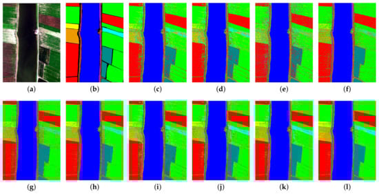 Classification maps for the whole scene on the LongKou data set. (a) False color image; (b) ground truth; (c) RAW; (d) PCA; (e) LPP; (f) LDA; (g) LFDA; (h) LGSFA; (i) SGDA; (j) LGDA; (k) CGDA; (l) LMSCPE.