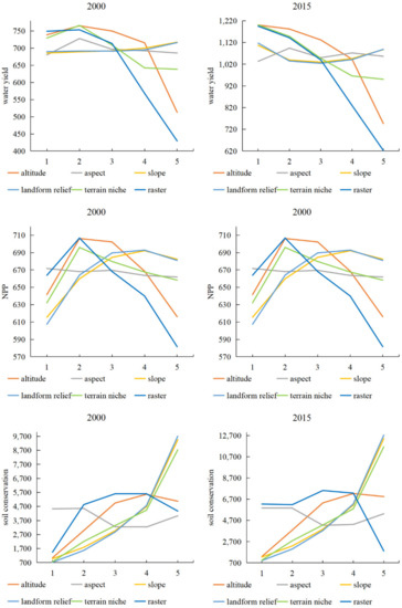 The mean ES values in each terrain zone and LHU are shown in Figure 5. Differences in the mean levels of ESs were assessed using ANOVA to reveal differences in ESs (p < 0.05) across terrain zones and LHUs. The water yield in 2000 in the three lowest altitude zones was similar (739.12 mm at 6–259 m, 765.40 mm at 259–441 m, and 750.15 mm at 441–680 m) and was significantly higher (p < 0.05) than that in the 680–1028 m zone (715.77 mm) and 1028–2861 m zone (513.17 mm). However, the water yield in 2015 decreased with increasing altitude. The water yield in 2000 first increased and then decreased with increasing aspect and reached the maximum value (728.18 mm) when the aspect was 72.61°–134.89°. In addition, the water yield in 2015 fluctuated with the aspect and reached the maximum value (1094.02 mm) when the aspect was 72.61°–134.89°. In both 2000 and 2015, the water yield of slope zones was very similar to that of corresponding landform relief zones. In 2000, the water yield increased with increasing slope and landform relief. However, in 2015, the water yield first decreased and then increased with increasing slope and landform relief, and the lowest value occurred at slopes of 2.33°–3.84° (1029.61 mm) and landform reliefs of 139–208 m (1024.13 mm). The water yield in 2000 in the two highest terrain niche zones was very similar (642.63 mm in the terrain niche of 1.41–1.74 and 638.65 mm in the terrain niche of 1.74–3.49) and was significantly lower (p < 0.05) than that in the terrain niches of 0.03–0.71 (729.60 mm), 0.71–1.10 (766.51 mm), and 1.10–1.41 (709.20 mm). However, the water yield decreased with the increase in terrain niche in 2015. The water yield in 2000 from the first LHU to the fifth LHU showed fluctuating changes, while the water yield in 2015 decreased from the first LHU to the fifth LHU. Water yield reached the maximum value in the second LHU (753.79 mm) in 2000 and in the first LHU (1195.29 mm) in 2015. In particular, for the same terrain zone or LHU, the water yield in 2000 was always lower than that in 2015.