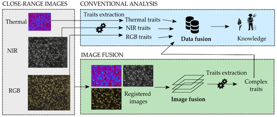 In recent years, close-range multi-sensor platforms and vehicles have been developed for crop phenotyping in natural conditions. The obvious interest of multi-sensor approaches lies in the ability to measure an increased number of pertinent traits. This is especially crucial when studying plant stresses whose symptoms are often complex and not determined by a single physiological or morphological component. For this reason, the philosophy for most modern field phenotyping platforms is to measure both physiological and morphological traits. This requires several types of sensor. On the one hand, spectrometers and 2D imagers provide plant reflectance (visible, near infrared (NIR), thermal IR, etc.) relative to physiological information. On the other hand, 3D cameras and light detection and ranging (LiDAR) devices provide morphological information. Platforms combining such sensors are described in [1,2,3,4,5,6,7]. Each sensor of the platform provides a number of plant traits related to the observed scene. Then, it analyses exploit traits from the different sensors to generate agronomic knowledge. This is what is habitually called “data fusion”. In this generic pipeline, the fusion of information from the different sensors takes place after the extraction of plant traits. However, the complementary nature of the information from the different sensors may also be exploited before that step of traits extraction. This is where the process of images fusion comes into play, as illustrated in Figure 1. Instead of considering separately the images of different cameras (red, green and blue (RGB), monochrome, thermal, depth, …), those images could be fused at the pixel level to enrich the available information [4]. Such a fusion would allow us to segment more finely the images and extract plant traits at a finer spatial scale. Instead of separating only leaves and background, the fusion of data for each pixel may allow us to identify upper leaves, lower leaves, sick tissues, wheat ears, etc. Then, each trait could be computed for those different organs instead of for the whole canopy. This would, for example, solve a well-known issue of close-range thermal imaging: isolating leaves of interest for water status assessment [8]. Image fusion would also allow us to disentangle the effects of leaf morphology and physiology on light reflection. This could be obtained by fusing leaf angles (for example from depth map from stereo camera) and reflectance maps. Such orientation-based reflectance has been suggested to improve thermal imaging by [9]. It is to notice that this paper only envisions the fusion of images, implying that 3D information is provided as a depth map (an image whose pixel values represent distances). The fusion of images and 3D points clouds from LiDAR devices is another hot research topic [10,11,12] but falls outside the scope of this study.