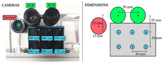 Those mono-sensor spectral devices can be classified into three categories: spatial-scanning, spectral-scanning and filters-matrix snapshot. The spatial-scanning cameras necessitate a relative movement between the scene and the sensor. They are costly [13] and best adapted for indoor applications. Images may be impacted by wind and illumination changes. They have been implemented in the field by, among others, [14,15,16,17]. The spectral-scanning cameras rely on filter wheels [18,19] or tunable filters, i.e., filters whose properties change to allow different spectral bands to pass [20]. Both methods suffer from the same inconvenient as spatial-scanning: the acquisition takes time and is impacted by natural conditions. The filters-matrix snapshot cameras [11] allow simultaneous acquisition of spatial and spectral information, but this comes at the expense of spatial resolution [20]. Unlike these devices, a cameras-array is able to instantly acquire all the spatial and spectral information, that can then be gathered by image fusion.
