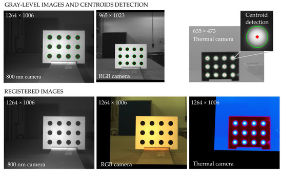 The calibration step was performed in laboratory by capturing the thermal calibration target (described in Section 2.1) at distances ranging from 1 m to 2.2 m by steps of 0.05 m. As the removable disks were of different temperature and of different color that the main body of the target, it was possible to detect the centroids of the disks in images from all the cameras. Those centroids served as key points to determine the best transformation at each distance (Figure 3).