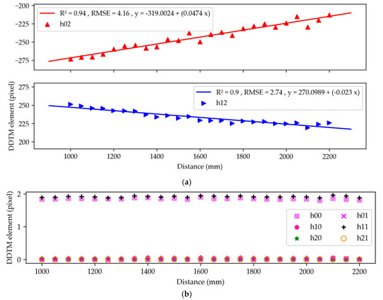 Relations between the distance of the target and the coefficients of the distance-dependent transformation matrix (DDTM) of the homography between the thermal slave image and the 800-nm master image: (a) distance-dependent coefficients; (b) distance-independent coefficients.