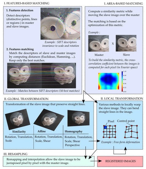 Instead of deducing the transformation from the relative positions of the cameras, those methods exploit similarities between the contents of the slaves and the master images to find the best transformation. They do not need a calibration although some of them need prior information on the transformation or initial alignment. They allow us to take into account the nature of the scene. The diversity of images-based registration methods are described in existing reviews [24,37]. An overview of the registration pipeline and of the different methods is presented in Figure 5. The first step of registration is called the matching (Figure 5. Step I). The aim is to detect corresponding zones in the master and the slave images. That correspondence may be feature-based or area-based. In feature-based methods, the goal is to identify a set of features (points, lines or patterns). The sets of features of the slave and the master images are compared to find matches. Popular methods exploit point features that are robust to scale and rotation changes. In the area-based methods, no features are detected. The matching between the images (or two windows from those images) is performed through the maximization of a similarity metric such as cross-correlation coefficient or mutual information. After establishing a correspondence, the second step of registration is to determine the geometric transformation to apply to the slave image (Figure 5. Step II). Transformations are divided into global and local methods. Global methods use the same mapping parameters for the entire image while the local methods are various techniques designed to locally warp the image. If there is no distortion between the images, rotation and translation are sufficient to align them. Otherwise, hypotheses on the distortion should be established to select either another global transformation (similarity, affine, homography) or a local transformation. For complex distortion, a possible approach is to begin with a global transformation and then to refine the registration using one or several local methods. Once coordinates in the slave image have been remapped, the last step consists in resampling the image to compute the new intensities (Figure 5. Step III). It involves convolutional interpolation algorithms such as nearest neighbors, bilinear (based on four neighbors) or cubic (based on 16 neighbors) [37]. Despite the development of more complex resampling approaches slightly outperforming the traditional ones, it is often sufficient to stick to the simple bilinear or cubic algorithm [24]. Registration approaches are mainly differentiated by the choice of the matching method and of the transformation model.
