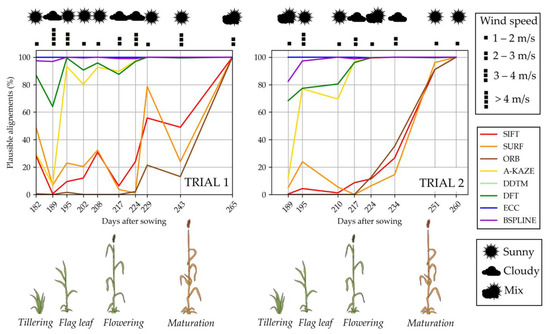 Beside this general comparison of the methods, it is also interesting to study the details of the evolution of the plausible alignments percentage by examining the values at different dates and for the two trials (different wheat varieties). An example of such evolution is presented in Figure 8 for the 490 nm images.