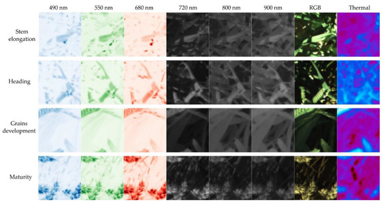 Illustration of registered images for all the cameras and at four wheat development stages. Thermal images have been registered using the ECC method the other using the B-SPLINE method. Images and images regions presented here have been randomly selected to avoid an operator selecting only pretty regions.