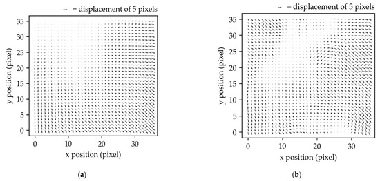 Example of slave image deformation fields for the B-SPLINE method with a final grid spacing of (a) 16 pixels; (b) 2 pixels. The deformation fields were extracted for a 36 × 36 pixels image region. The lengths of the arrows are proportional to the pixel displacement.