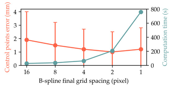 Default parameters used for this study implied an initial grid of 128 pixels refined to 64 and 32 pixels to reach a final grid spacing of 16 pixels. Additional trials were carried out for the vegetative validation images set by reducing the final grid spacing to 8, 4, 2 and 1 pixels. Trials on the 900 nm images showed that it was important to gradually warp the images. To reach a final grid spacing of 1 pixel, the steps were grids of 128, 64, 32, 16, 8, 4 and 2 pixels. Burning steps by directly reducing the grid from 32 pixels to 1 pixel, for example, caused aberrant deformations. Concerning the other image types (RGB, thermal, 490, 550, 680 and 720 nm), all grid refining levels led to aberrant deformations. Grid refining only worked on the 900 nm images thanks to their intensity content close to the 800 nm master images. Figure 11 details the effect of grid refining (for the 900 nm images) on control points error and computation time. The smallest average error was obtained for a final grid spacing of 2 pixels. However, the computation time was eight times higher than for a grid spacing of 16 pixels. Results also demonstrated that refining the final grid spaces to 1 pixel had no interest. Not only the error was higher than for a 2-pixel spacing but also the computation was extremely slow. It is also to note that for the 1-pixel spacing, some aberrant deformations were visually noticed.