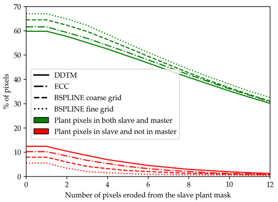 Erosion of 900 nm slave plant mask was tested for erosion values of 0 to 12 pixels. The impact on the remaining plant area and the plant mask error is presented in Figure 13 for four registration methods of interest. It shows that the error tended to reach an asymptote while the exploitable plant area continued to decrease. The asymptote of plant mask error was close to zero. For an erosion of 12 pixels, error values were 1.2%, 0.8%, 0.7% and 0.5%, respectively for the DDTM, ECC, B-SPLINE coarse final grid (16 pixels) and B-SPLINE fine final grid (2 pixels) methods. The remaining errors may have been artificial errors due to a difference of plant segmentation between the 800 and 900 nm images. Those curves imply that erosion of the common plant mask should be adapted to the quality of the registration method. Theoretically, for a perfect registration, no erosion would be necessary. By contrast, for huge erosion values, the quality of the registration would have less importance. This is well illustrated in Figure 13. As the erosion value increased, the difference between the registration methods decreased. For each method, it is possible to assess the added value of a greater erosion by looking at the slope of the error curve (red curve) in Figure 13. For DDTM, an erosion of more than 8 pixels would be advised. For ECC, an erosion between 6 and 8 pixels would be a good compromise. For B-SPLINE, erosion could be limited to 6 for a coarse final grid or to 3 pixels for a fine final grid.