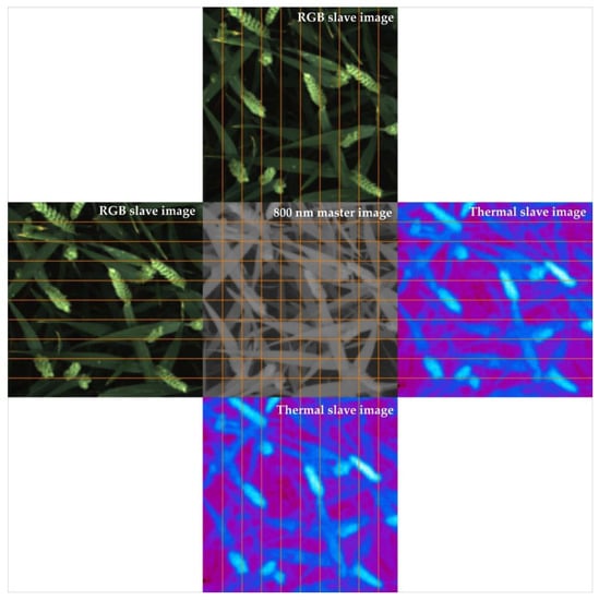 Most of the studies that included close-range plants registration concerned thermal and RGB images. It is worth noting that some commercial cameras are able to acquire both RGB and thermal images that are roughly aligned using undocumented registration methods [21]. However, plant researchers relied most of the time on separated cameras and had to deal themselves with the registration step. The most basic approaches were the manual selection of matching points in the slave and master images [8,22] or directly the empirical choice of an unique transformation for all the images [5]. An automatic method was developed by [23] to align thermal and RGB images of side-viewed grapevines. In another study, [9] solved the problem of RGB-thermal registration for maize images. They validated the method using a heated chessboard. The error measured on a simple pattern such as a chessboard may, however, not be representative of the error occurring in a complex crop canopy image. That claim is supported by the fact that the matching is far more complex on plant structures. Even assuming an optimal matching, the different points of view of the cameras may lead to additional errors caused by parallax and visual occlusions. This implies that measuring the registration errors is a difficult task and that the distortion between the images is often complex. None of the plant registration approaches presented above succeeded in taking into account local distortion in the images. Indeed, those approaches relied on global transformations, i.e., functions for which the mapping parameters are the same for the entire image [24]. Nonetheless, the parallax effect alone makes the distortion dependent on the distances of the objects. When acquiring multimodal images from aerial vehicles, this effect is negligible because of the huge distance between the cameras and the scene compared to the displacement of the optical centers and the distance between the objects themselves [25]. At close range, local distortion between the images, and especially parallax effect, may have a significant impact on registration quality. A possible track to solve the issue would be to use a local transformation, i.e., a transformation that is able to locally warp the slave image. The use of such transformations is very scarce in the field of plant sciences but common in other fields such as multimodal medical imaging [26,27]. Local transformations on images of potted-plants were used by [28,29]. To the best knowledge of the authors and at the time of writing, no study has provided a solution for the registration of close-range wheat canopy images. Nevertheless, [30,31] studied wheat images registration under controlled conditions and on isolated potted-plants. They tested three matching methods on side-viewed wheat to align fluorescence and RGB images. The study stuck to a global transformation.