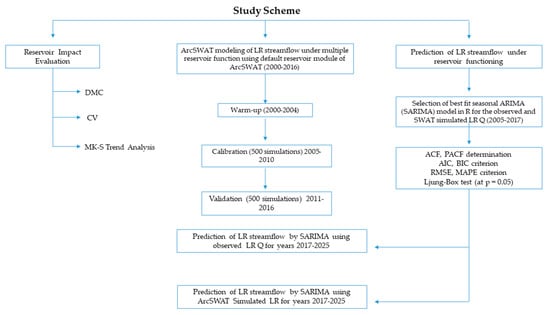 R2, root mean square error (RMSE), and mean absolute percentage error (MAPE) were selected to assess the ability of SARIMA in forecasting the LR discharge. A Ljung–Box test [74] at p = 0.05 was also performed to make sure best fit of the SARIMA model for both time series for LR discharge. Finally, we applied the best fitted models to forecast the monthly LR discharge using the observation-based and simulation-based hydrological time series. The schematic representation of study design is shown in Figure 2.
