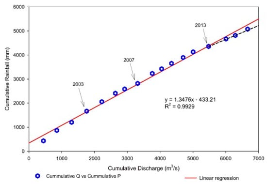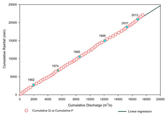 To reckon LR discharge change under reservoir influence, DMC analysis, along with regression lines for two time spans, was carried out to better understand the hydrological phenomena and the likely change years in the time series. The double-mass curves for annually recorded rainfall and discharge, following the work of Searcy and Hardison (1960) [75], were individually applied for the time spans of 1956–2016 and 2000–2016 (Figure 3 and Figure 4) respectively. The application of individual cumulative mass curves for two time spans was done with the aim of developing a more valid and reliable impact assessment in terms of change in the hydrological time series of the LR.