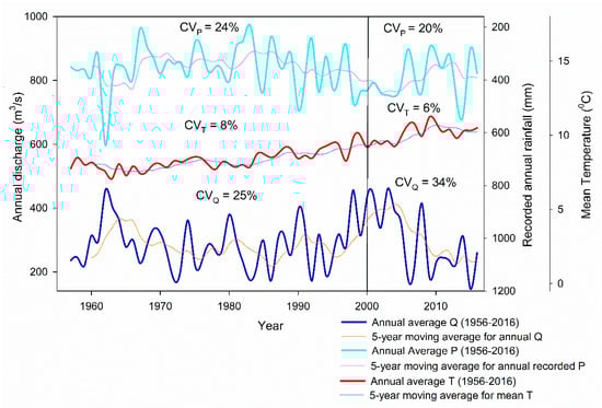 Figure 5 shows the inter-annual variation of the hydro-meteorological behavior of the LRB along the two time phases. The CV for the hydro-meteorological phenomena from 1956 to 1999 and from 2000 to 2016 exposed an aggravated variability in the latter time span compared to the previous time span. The CV of 24% for LRB precipitation during 1956–1999 was lowered to 20% in the second time span of 2000–2016; however, the CV values for both time spans were relatively closer, which means that the change in the pattern of precipitation advanced with a greater pace in the study time span compared to the former long time span of 1956–1999. Similarly, for the annual temperature, the CVs of 8% and 6% for the time spans of 1956–1999 and 2000–2016, respectively, were again closer values and revealed a faster temperature change in the LRB during 2000–2016.