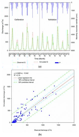 The performance of the SWAT model in simulating LR discharge under the chosen reservoirs’ influence for the time span of 2000–2016 is presented in Figure 6a. A comparison of observed and simulated LR discharge is shown in Figure 6b. The simulated hydrological time series corresponded appreciably well to the observed data series and regularly fluctuated with the precipitation pattern. The high peaks were very well captured by the SWAT model most of the time, particularly during the calibration years (2005–2010), with a few being under-estimated. For the validation years (2011–2016), the model again managed to capture the high peaks, but some peaks were under-estimated. The lower flow was consistently under-estimated by the model. A similar weakness of the SWAT model in capturing the low flows of the LR was reported in [25]. Overall, the model performed well in simulating the LR streamflow by conforming to the work of Moriasi et al. (2007) [79], where the modeling performance was acceptable if R2 > 0.5, NSE > 0.5, and PBIAS < ±25%. The performance of the SWAT model during calibration and validation is presented in Table 4. However, the comparison between observed and simulated hydrological data series revealed an R2 value of 0.75 (Figure 6b), and majority of the values were enclosed by the 95% prediction and confidence interval. Few of the high flow values were dispersed because they were under-estimated by the model. This confirmed the competency of the SWAT model in simulating the LR discharge under the reservoir operations selected for the current study.