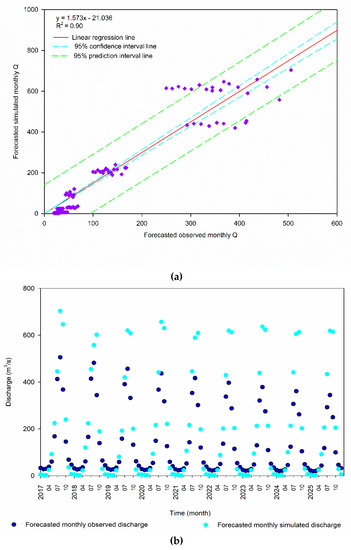 The comparison of observation-based and simulation-based LR discharge presented in Figure 8a showed a very close correspondence between both hydrological time series with an R2 of 0.90. However, the simulation-based forecasted LR discharge was higher for high flow months in future. In advancing through the years from 2017 to 2025, the difference in the high peaks was seen to be increasing among the observation and simulation-based forecasted LR discharge, as presented in Figure 8b. However, both hydrological data series were shown to experience a decrease in the future years researched in the study.