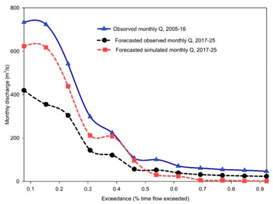 A flow–duration curve offers a practical approach for studying the flow characteristics of streams and for examining the association of one basin with another. A flow–duration curve is a cumulative frequency curve that shows the percent of time during which specified discharges were equaled or exceeded in a given period. A rather easier conception of the flow–duration curve is that it is a streamflow data demonstration combining the flow characteristics of a stream throughout the ranges of discharge in one curve [80]. The flow–duration curves for the observed LR discharge and forecasted observation-based and simulation-based LR discharge are presented in Figure 9.