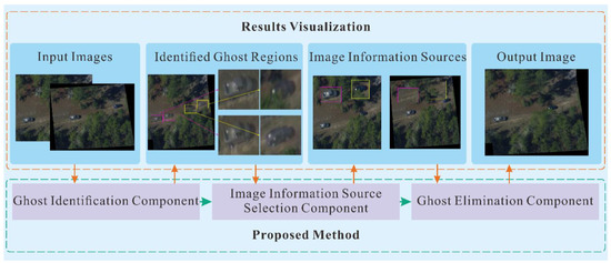 The proposed multi-component cooperative ghost identification and elimination method is divided into three components: ghost identification, image information source selection and ghost elimination. The three components cooperate to complete the ghost identification and elimination in UAV remote sensing image mosaic to produce natural mosaic results. We show the collaboration flow of the three components in Figure 1.